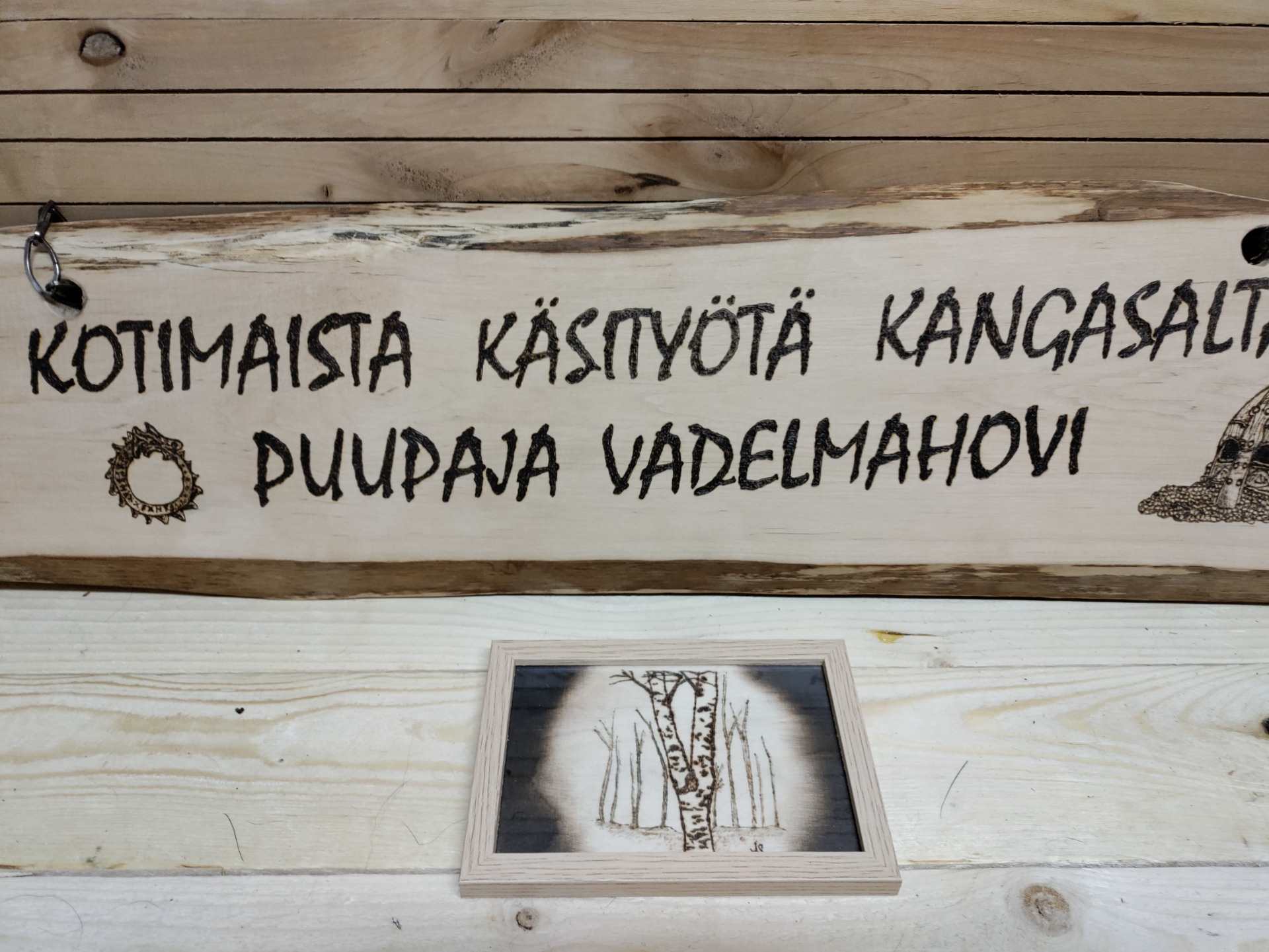 Kehystetty taulu jossa polttopiirretty kuva, koko n. 10x15cm.