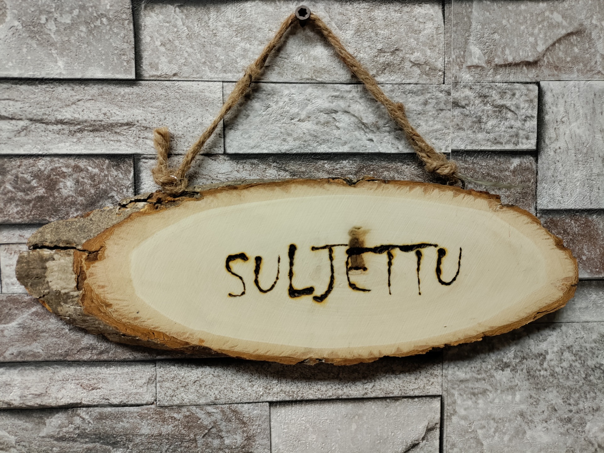 Puinen ovikyltti tekstillä "avoinna" sekä toisella puolella "suljettu"