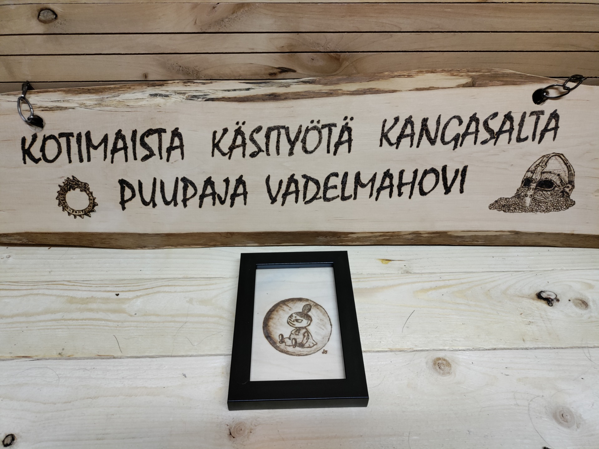 Kehystetty taulu jossa polttopiirretty kuva, koko n. 10x15cm.