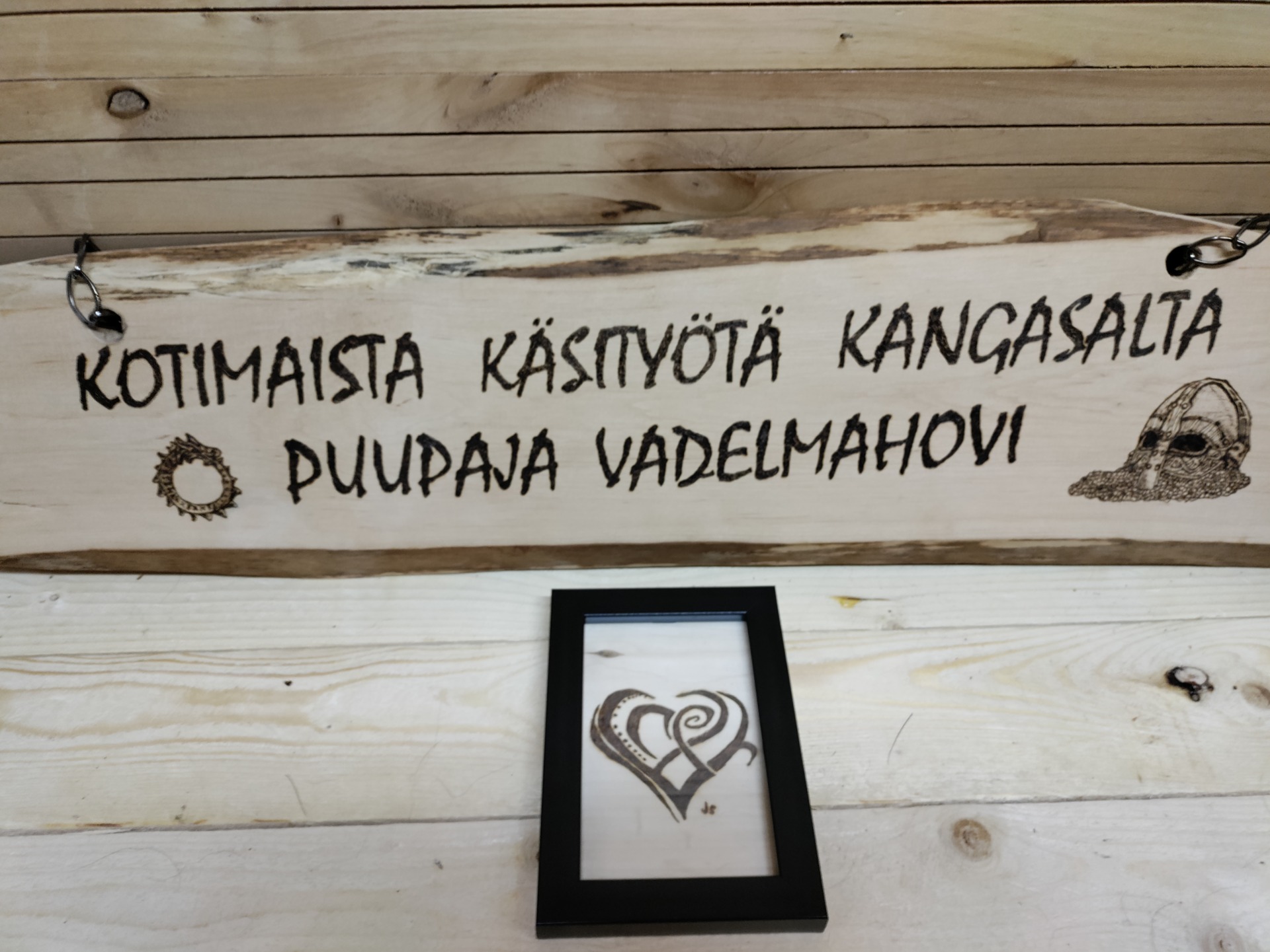 Kehystetty taulu jossa polttopiirretty kuva, koko n. 10x15cm.