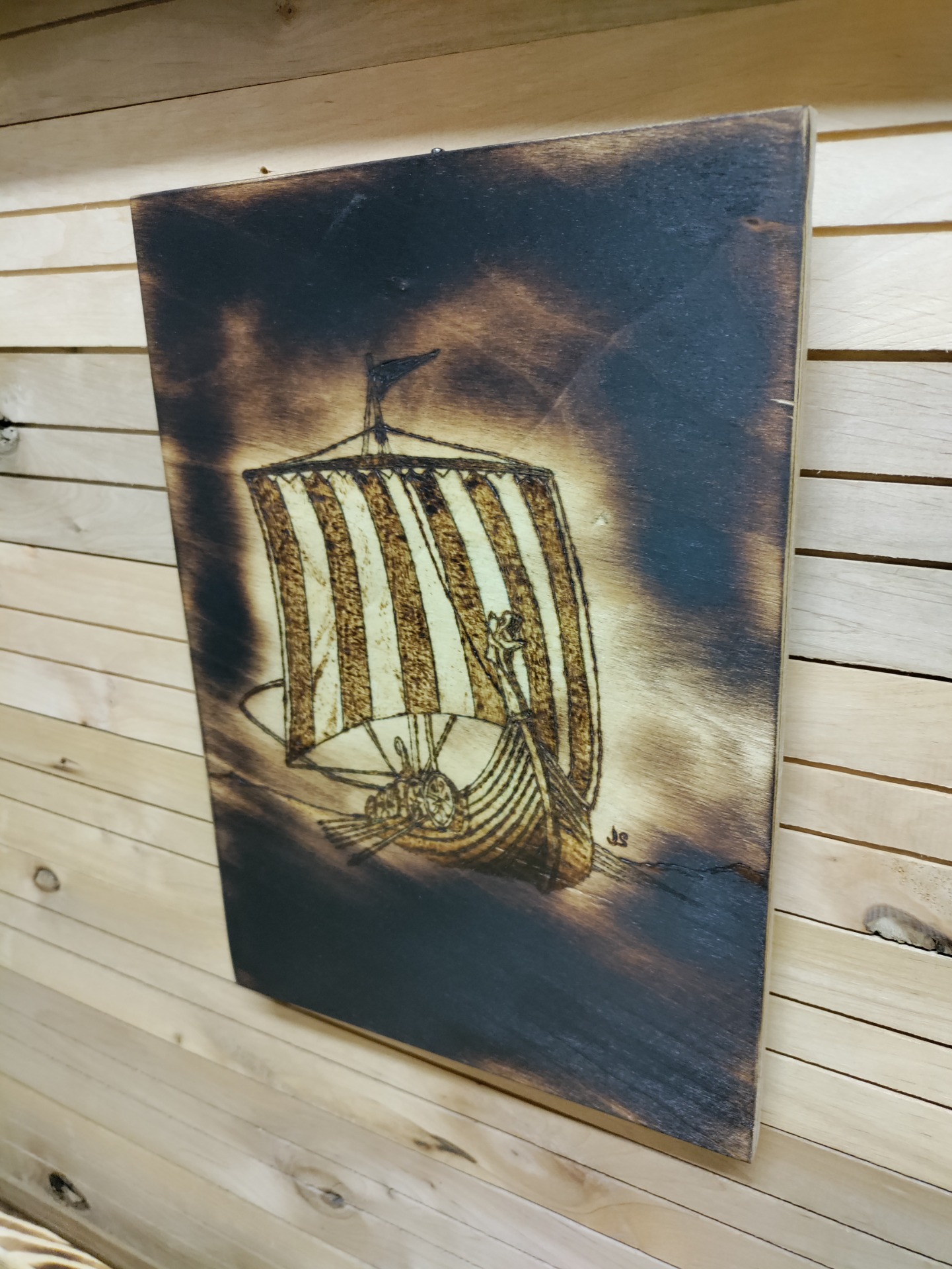 Hieno viikinkilaiva taulu, polttopiirretty koivuvaneriin. Koko noin 21x30cm