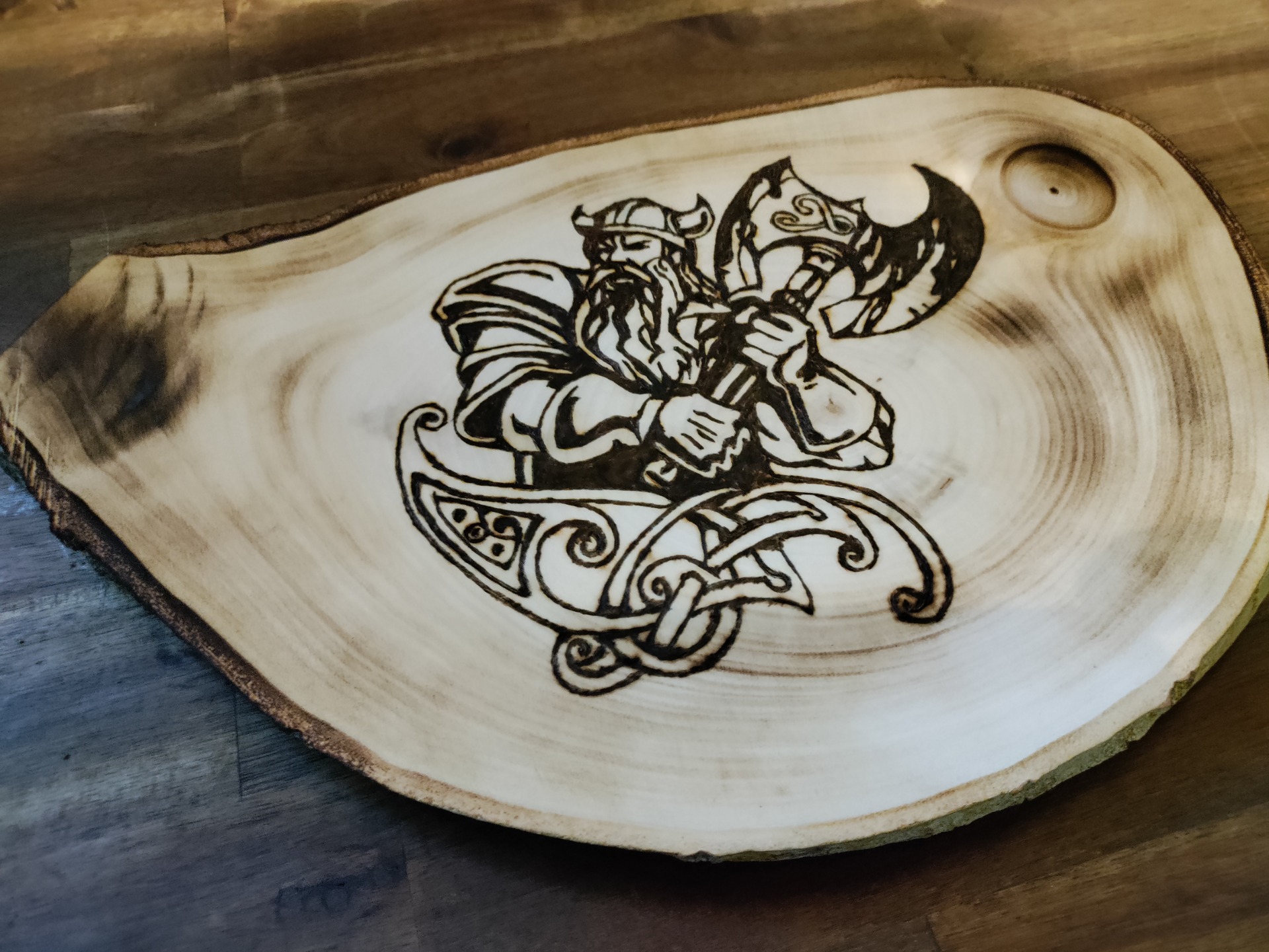 Hieno viikinkitaulu. Komea koriste seinälle. Poltettu haapa"lautaselle" ja töhötelty puun kuviot esille. Teemaan sopivasti esiin sai korostettua kynnen jäljet ja kuun.